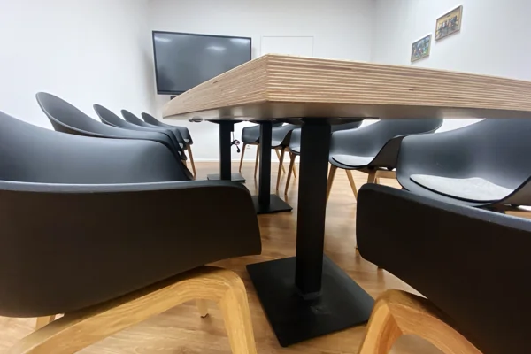 Nach der Fertigstellung erfolgte die Lieferung und Montage direkt beim Kunden. Schon beim Aufstellen des Tisches wurde spürbar, wie gut sich das Stück in den Raum einfügt. Die dunklen Metallbeine harmonierten mit den architektonischen Linien des Konferenzraums, während die warme Eichenoberfläche einladende Akzente setzte. Die dreiteilige Konstruktion ermöglichte zudem eine exakte Anpassung an Raumgröße und Sitzordnung – sowohl funktional als auch ästhetisch überzeugend.