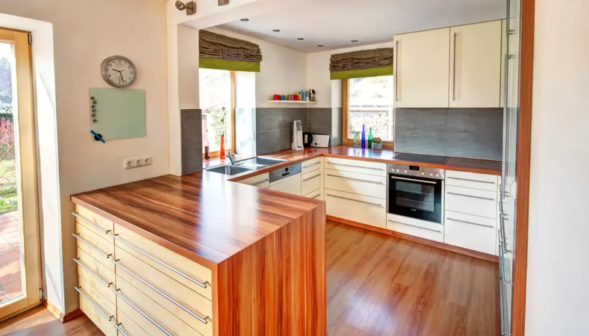 Auf der Raumseite setzen die Holzfronten einen wohnlichen Akzent und nehmen die natürliche Anmutung der Arbeitsplatte wieder auf. Ergänzt wird das Materialkonzept durch lange Edelstahlgriffe und einen zurückhaltenden grauen Wandspiegel, der die Küche modern rahmt. Wer sich für die Wirkung verschiedener Werkstoffe interessiert, findet auf unserer Seite zu Materialien viele weitere Einblicke.