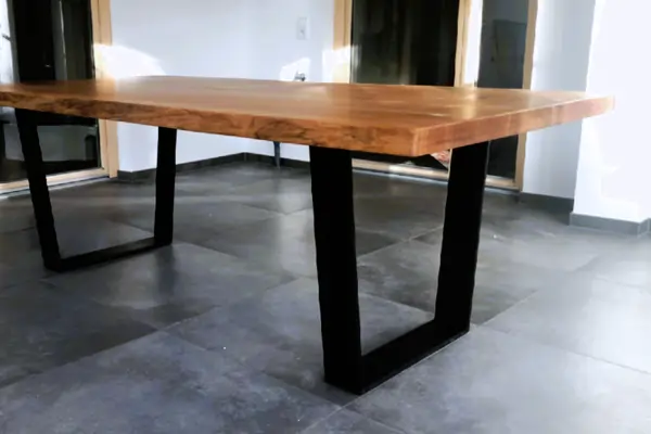 Ein Tisch mit einer rechteckigen, Eichen Holzplatte und einem schwarzen Metallgestell. Das Gestell besteht aus zwei trapezförmigen Beinen, die jeweils an den Enden der Tischplatte befestigt sind. Der Boden ist mit großen, dunkelgrauen Fliesen bedeckt. Im Hintergrund sind weiße Wände und ein Fenster mit schwarzem Rahmen zu sehen.